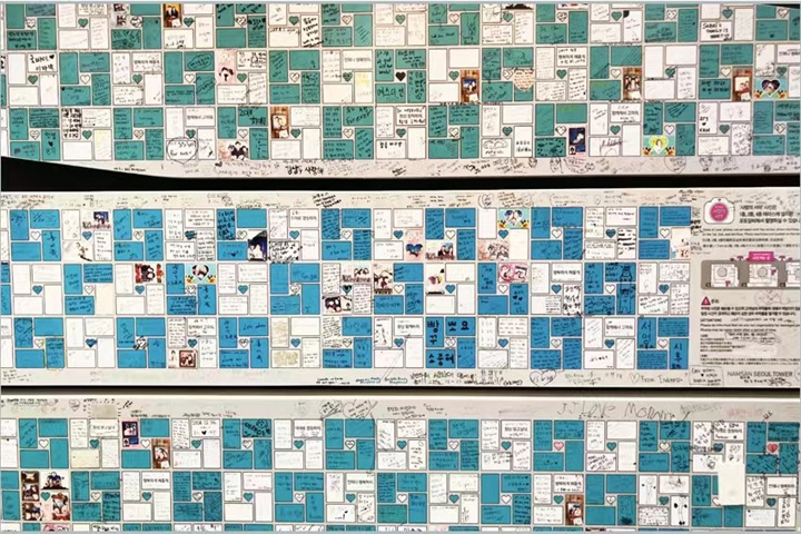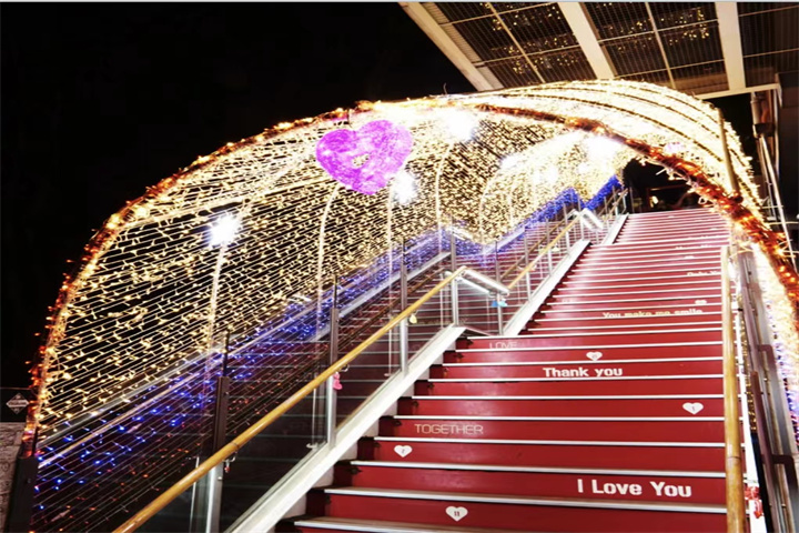 爱情隧道楼梯下面有可以留下爱情信息的涂鸦空间。实现愿望的爱情涂鸦墙!