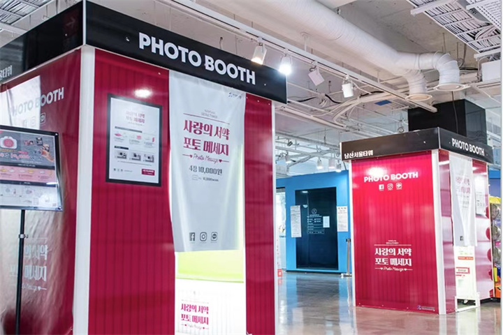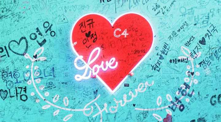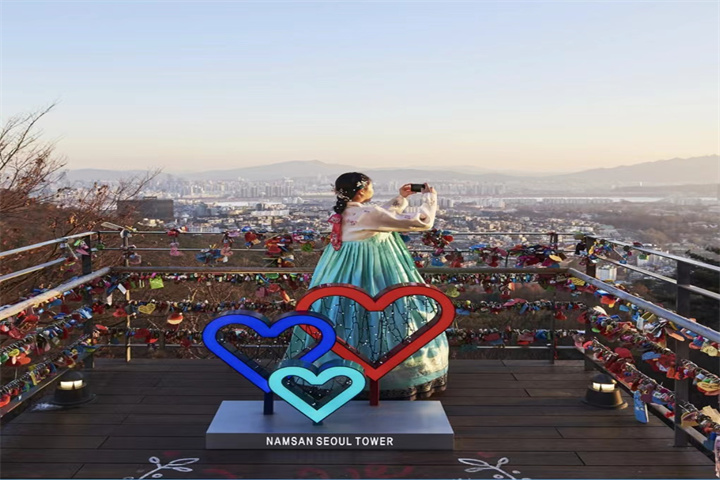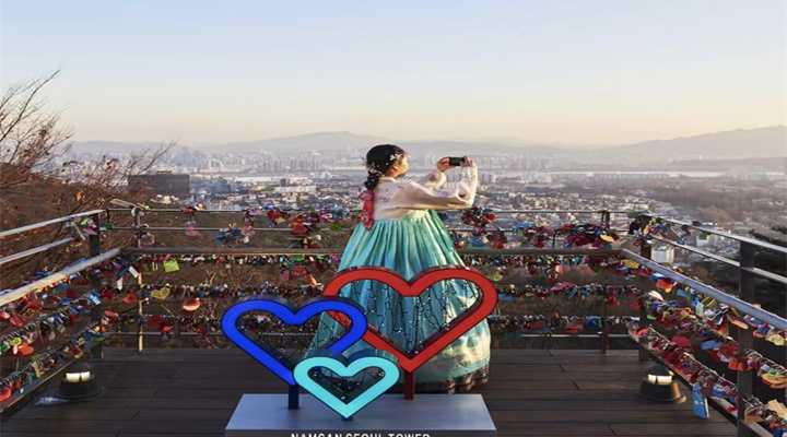 在红色、天空、蓝色发光的心形造型物中,留下爱情的瞬间。位于连接南山首尔塔1层和大厅的野外楼梯上。为了方便使用者,还准备了自助相机的放置台。