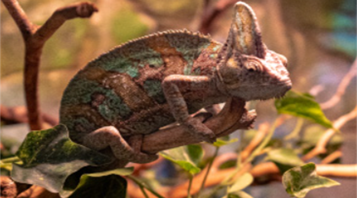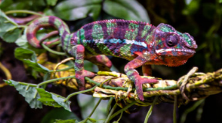接下来是属蜥蜴目的豹变色龙。即使是在各种变色龙之中,它也是最为色彩斑斓的存在。与人们所预想的不同,它并不会为了伪装而根据周围环境改变体色,而是根据体温与情绪、或者作为沟通交流的手段而变换身体的颜色。同属于蜥蜴目的高冠变色龙拥有酷似头盔的头部,因此也被称为“假面具变色龙”,它的头部可以汇集血液从而用于降低体温,还能够迅速弹射出粘稠的长舌捕捉昆虫。