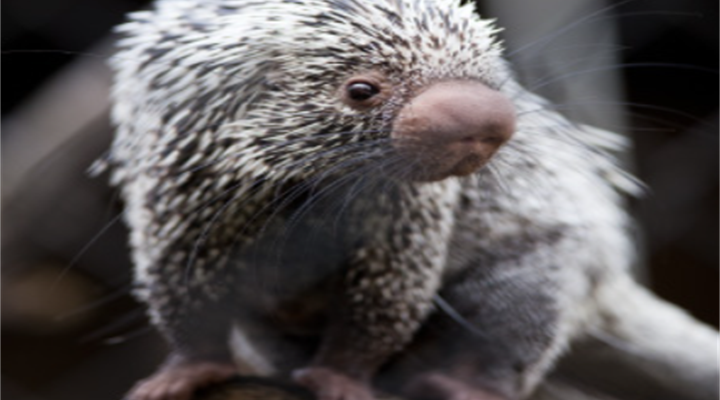 这个动物是豪猪,它会在树上度过一生中的大部分时间,几乎不会下到地面之上。它们能够用具有强劲肌肉的长尾抓住树枝轻松攀爬树木。而且据说在树木之间移动时,长长的趾甲会发挥巨大的作用。在受到威胁或者被激怒时它们会把身上的刺竖起来进行防御。据说幼崽时期红褐色的毛发会随着身体的成长逐渐变硬最后变成尖刺。