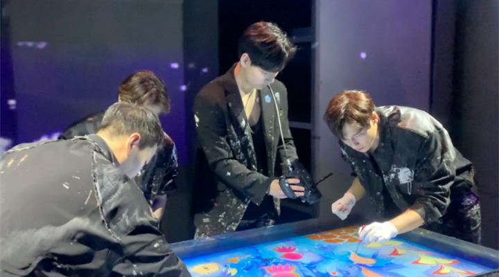 演员们利用水和油分离的原理在水面上画画的表演!并且还用石采画,沙子图等技法瞬间完成大型作品海市蜃楼。也有素描画,夜暗中呈现浪漫的夜光画,还搭配着演员小哥们炫酷的舞姿,视觉效果一绝!