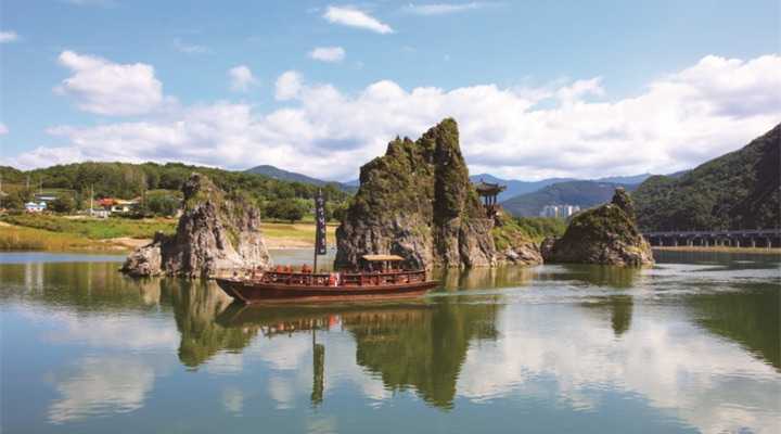以丹阳郡(단양군)为中心,聚集了12公里左右的美丽名胜,被称为丹阳八景。岛潭三峰(도담삼봉),石门(석문),四寅岩(사인암),上仙岩(상선암),龟潭峰(구담봉),玉顺峰(옥순봉),中仙岩(중선암),河仙岩(하선암)。