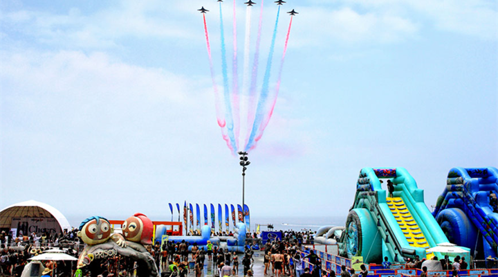 大川海水浴场大体分为晚霞广场和泥浆广场区域,避暑季节可以看到不同的娱乐场所。